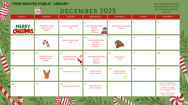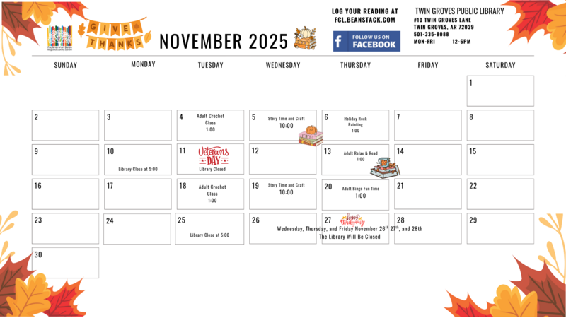 The Twin Groves Library is a branch library of the Faulkner-Van Buren Regional Library System. The Faulkner county library began as a WPA project in 1935. Twin Groves library, established in 1998 by community members, fills a dual goal. The community wanted to preserve the historic structure and provide library services to the children and adults who live in this remote north part of Faulkner County. The libraries in the library system as well as the Twin Groves library, strive to serve as community hubs--providing a space for community members to meet and exchange ideas.